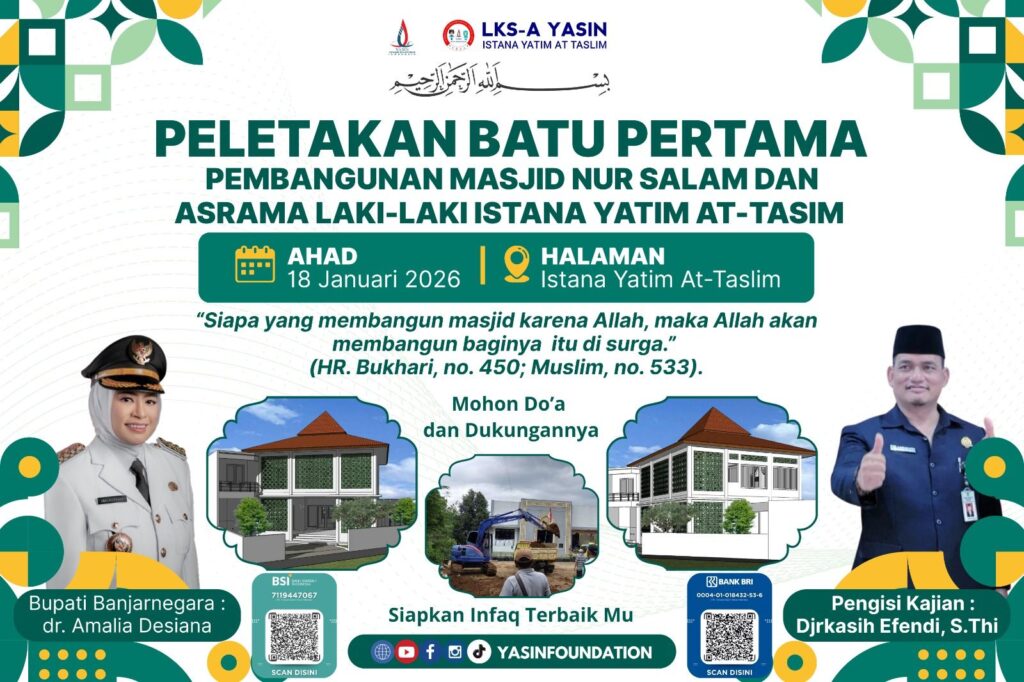 Yayasan Salam Abadi Indonesia (YASIN) memperingati Isra’ Mi’raj Nabi Muhammad SAW sekaligus menggelar peletakan batu pertama pembangunan Masjid Nur Salam dan Asrama Putra di Istana Yatim At-Taslim, Kampung Telaga, Desa Gumiwang, Kecamatan Purwanegara, Minggu (18/1/2026).