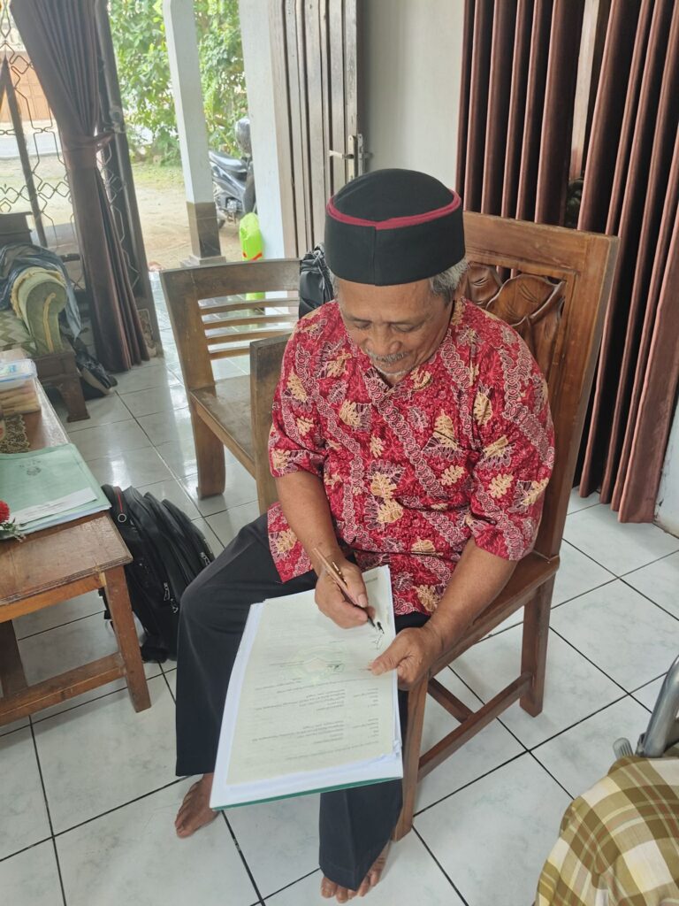 Dalam suasana penuh kehangatan dan kedekatan, Ketua YASIN tampak memijat jari-jari dan kaki H. Taslim. Ungkapan lirih rasa nyaman (“kepenak”) terdengar dari beliau. Pada kesempatan itu disampaikan bahwa seluruh berkas pengajuan wakaf telah disetujui Badan Wakaf Indonesia (BWI) Pusat dan siap dilaksanakan ikrar wakaf. Hasil koordinasi dengan Kepala KUA disepakati pelaksanaan ikrar pada Jumat, 9 Januari 2026 pukul 10.00 WIB, bertempat di kediaman H. Taslim. Mendengar hal tersebut, beliau menyatakan siap.